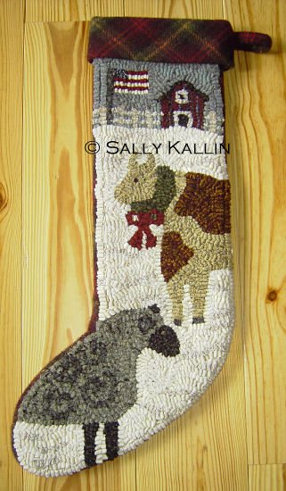 Sheep & Cow Stocking © 2006 Hooked by Sally Kallin Look for this one in the November/December 2006 issue of Rug Hooking Magazine. #169 - 20 ½" long - $42 |