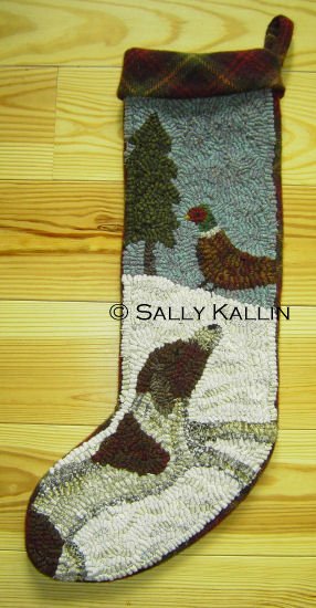 | Dog & Pheasant Stocking © 2006 Hooked by Sally Kallin Look for this one in the November/December 2006 issue of Rug Hooking Magazine. #170 - 20 ½" long - $42 |
